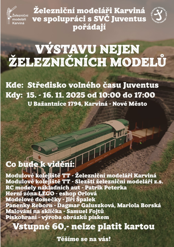 O víkendu 15. a 16. listopadu se zúčastníme výstavy železničních a dalších modelů. K vidění bude modulové kolejiště ve velikosti TT, modelové domečky, Rc modely nákladních aut a další. Nás zde uvidíte s Gčkovým kolejištěm.