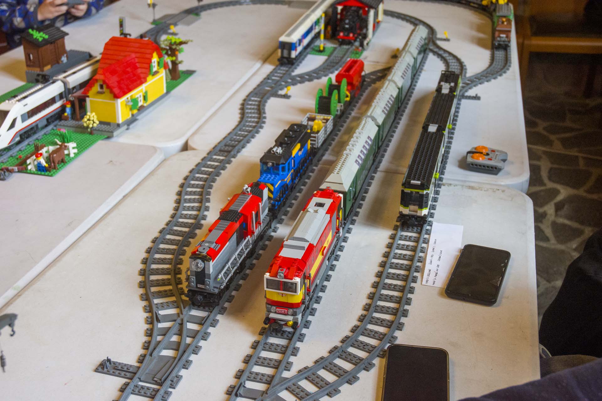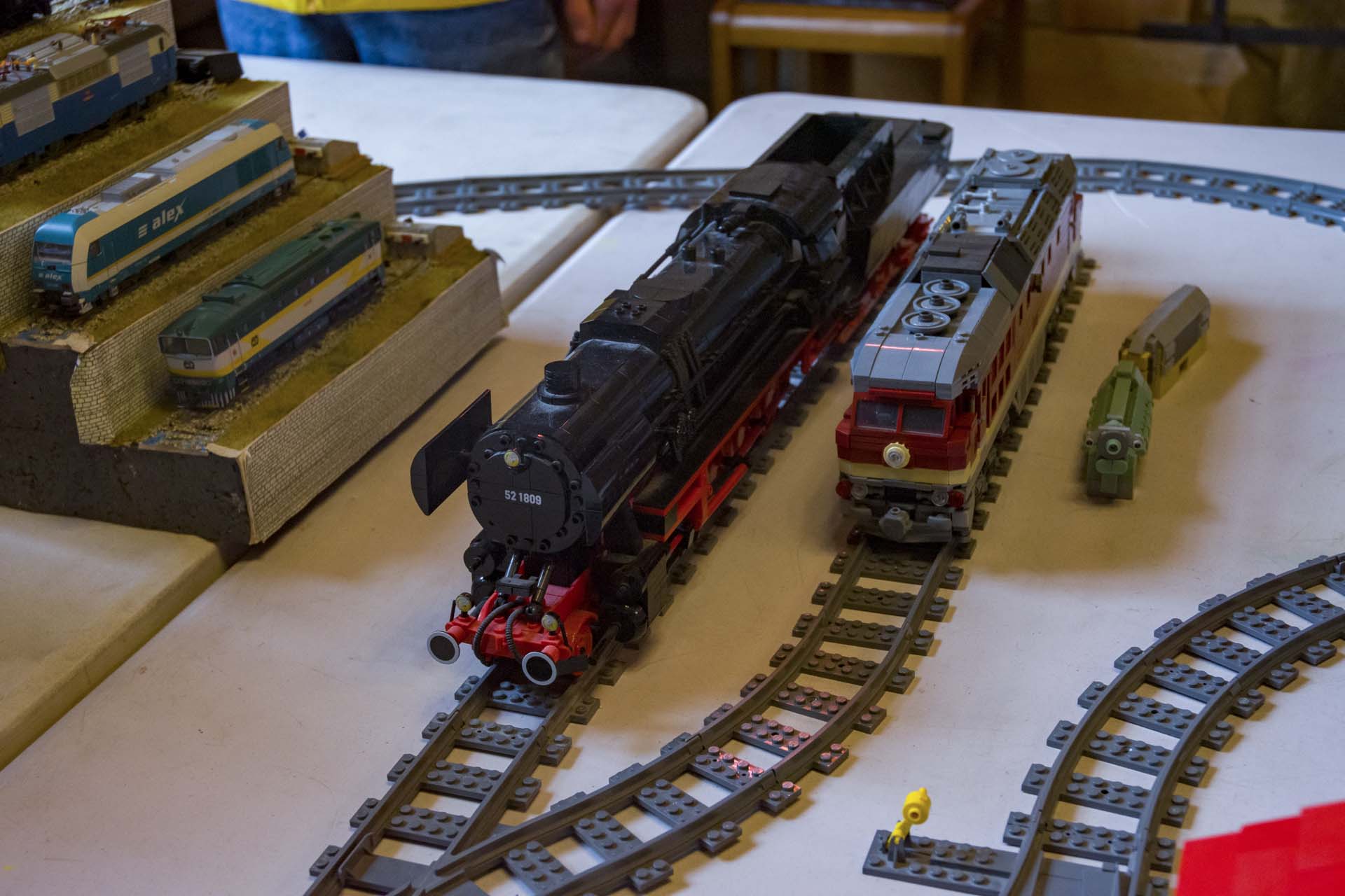 Kromě Gčkového kolejiště, návěstidla a přejezdu jsme vystavovali i Lego vláčky. Druhý březnový víkend byl ve znamení českých modelů vlaků ze stavebnice Lego. Na kolejišti zak bylo možné potkat Brejlovce s patrovými vozy či rychlíkovou soupravou, lokomotivu 741.6, Parní lokomotivy BR52 "Němka" a BR80 či dieselovoou lokomotivu BR130 "Ragulin".