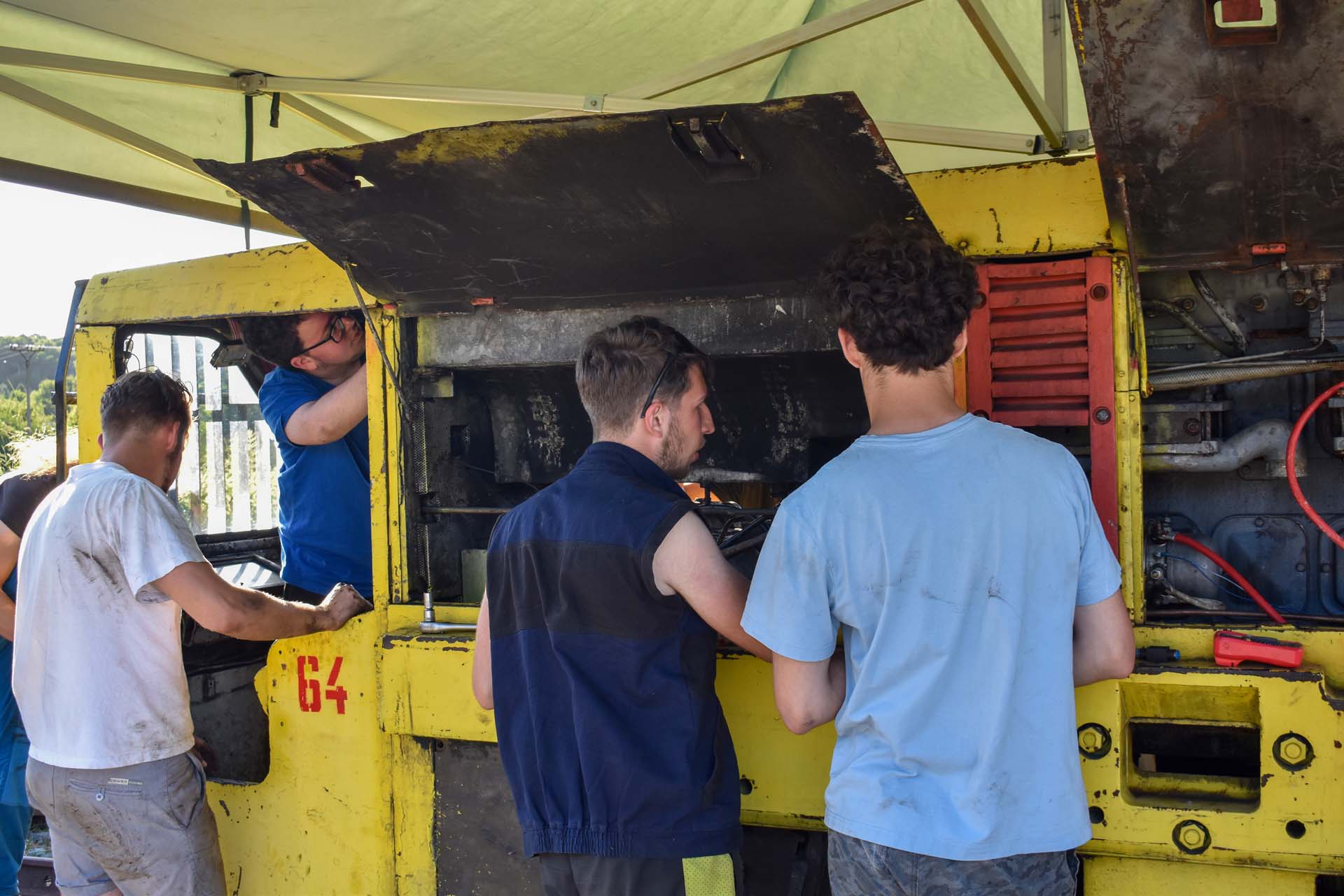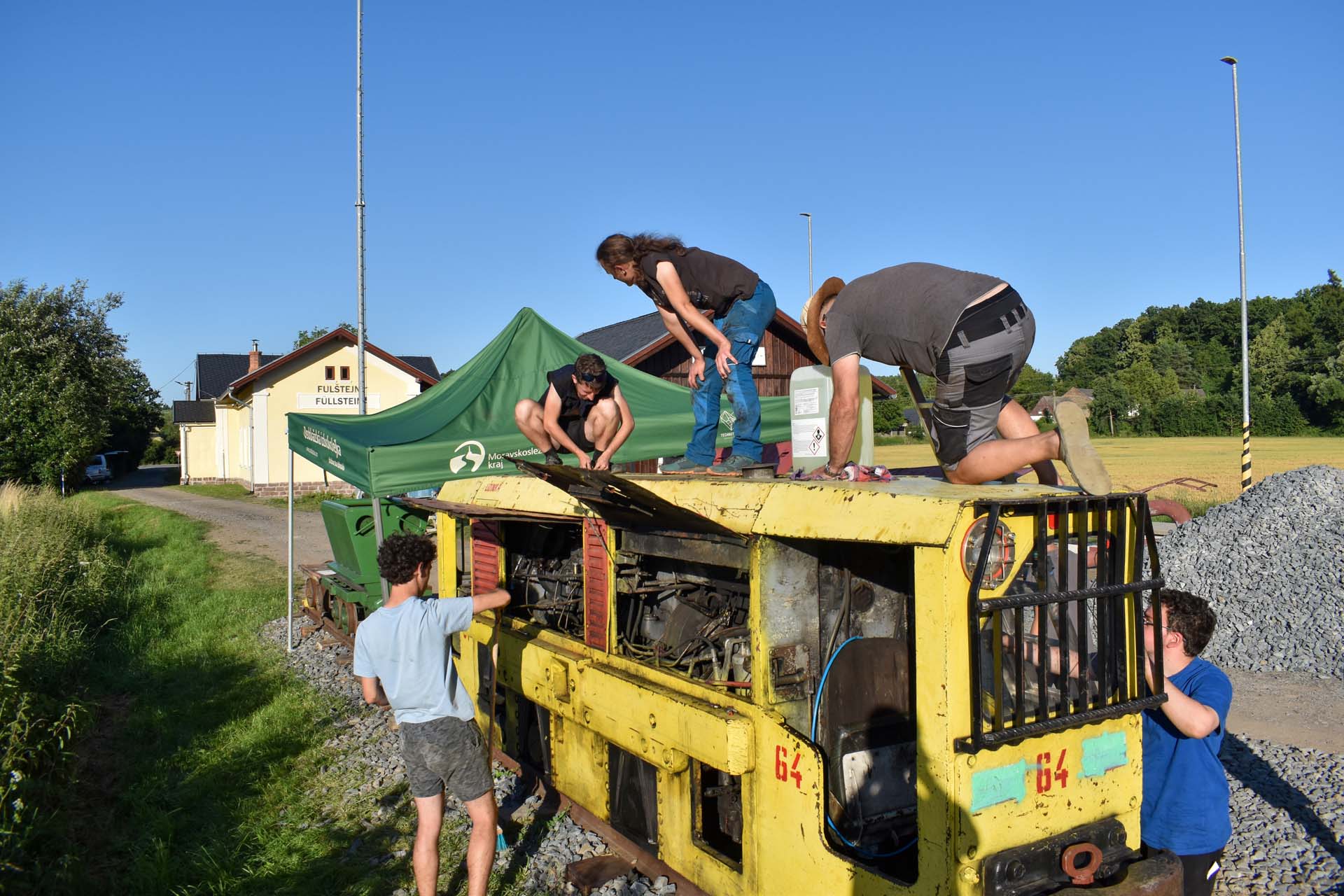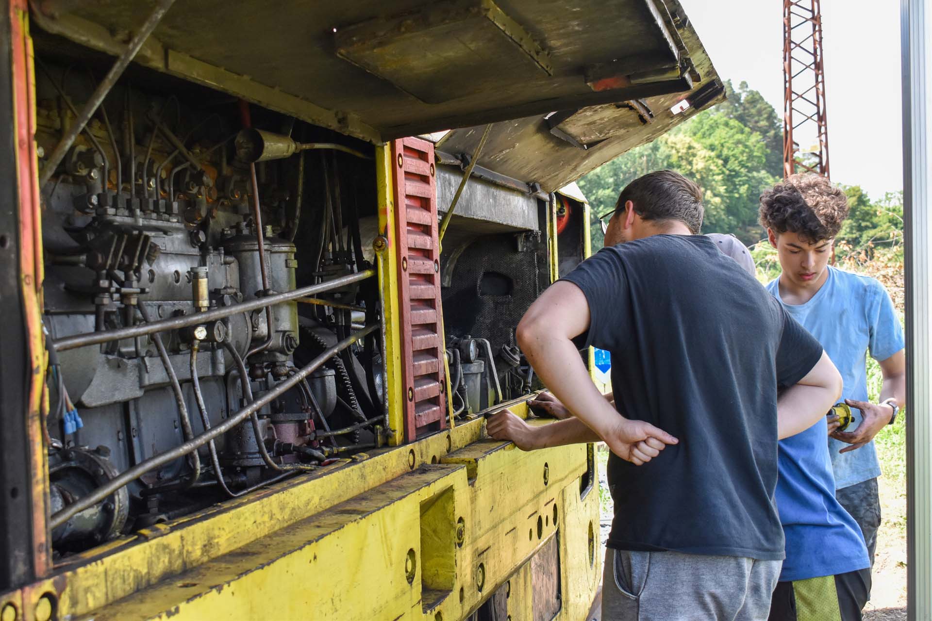 Vykládka důlní lokomotivy na nádraží v Bohušově